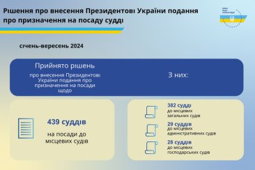 Упродовж січня - вересня 2024 року Вища рада правосуддя прийняла рішення про внесення Президентові України подання про призначення на посади 439 суддів до місцевих судів, з них: