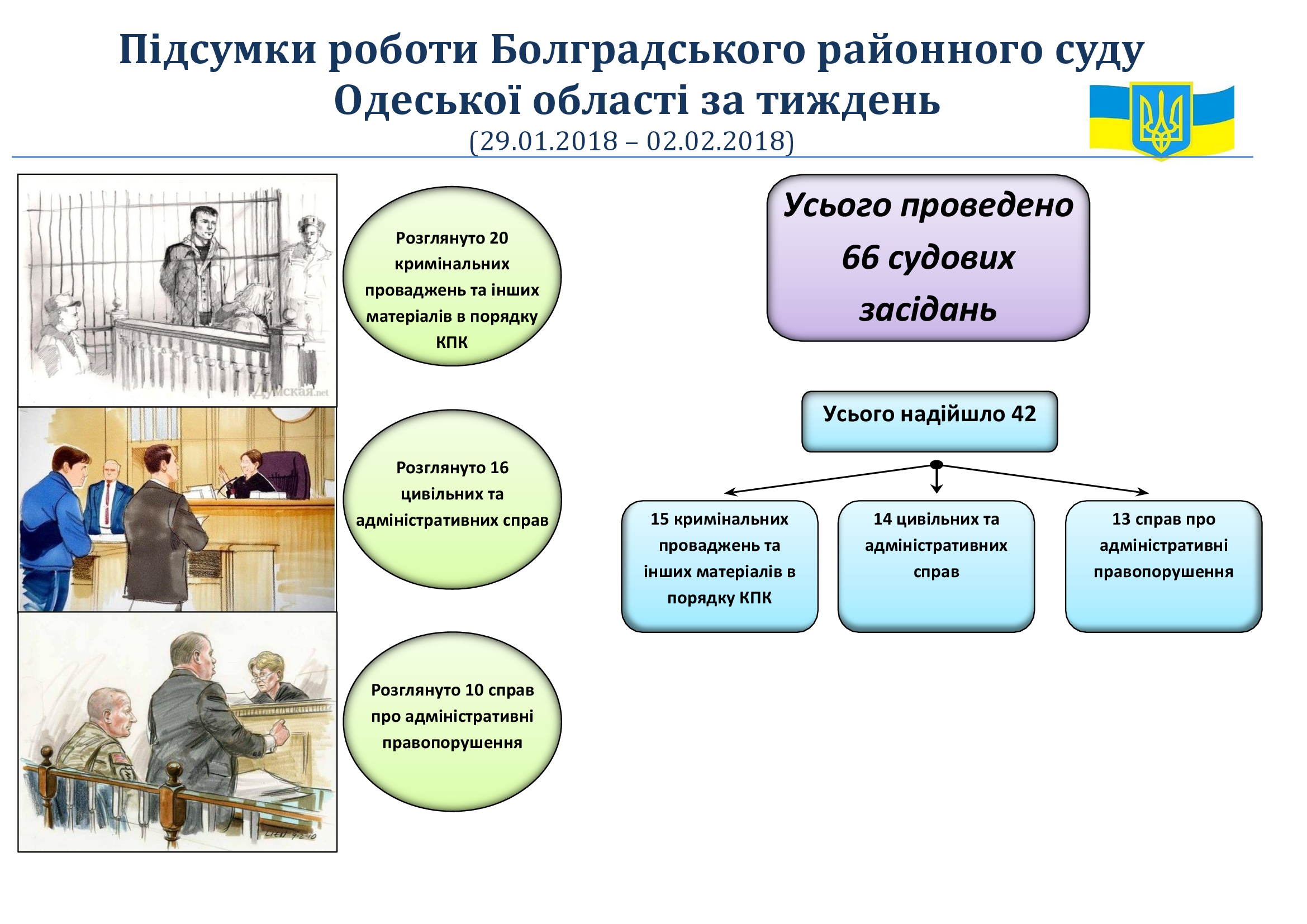 66 судових засідань - Болградський районний суд Одеської області прозвітував за тиждень діяльності