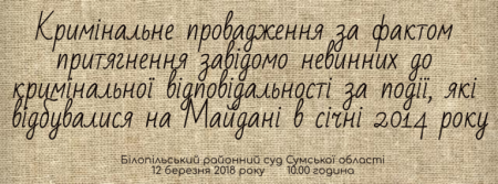 Розгляд кримінального провадження стосовно колишніх прокурора прокуратури м. Сум С. і слідчої слідчого відділу Сумського МВ УМВС України в Сумській області П., обвинувачених за ч. 2 ст. 372 Кримінального Кодексу України (притягнення завідомо невинного до кримінальної відповідальності) Білопільським районним судом Сумської області відкладено на 10:00 12 березня 2018 року.