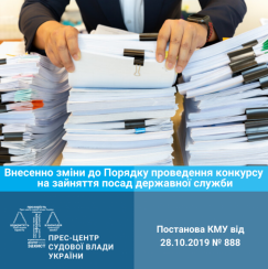 Постановою Кабінету Міністрів України від 28 жовтня 2019 року № 888 внесено зміни до Порядку проведення конкурсу на зайняття посад державної служби, затвердженого постановою Кабінету Міністрів України від 25 березня 2016 р. № 246 (Офіційний вісник України, 2016 р., № 28, ст. 1116; 2017 р., № 57, ст. 1687, № 71, ст. 2163, № 76, ст. 2323, № 88, ст. 2698; 2018 р., № 4, ст. 161, № 41, ст. 1453, № 47, ст. 1643; 2019 р., № 47, ст. 1604, № 66, ст. 2289, № 78, ст. 2695).