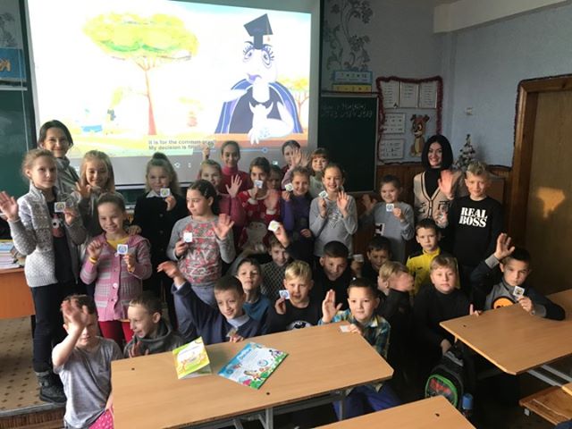 Майже 120 учнів четвертих класів переглянути мультфільм «Слон проти Жирафи», у якому відбувається спір між  Слоном і Жирафою, який вирішує суддя Черепаха. Учні спробували чесно та справедливо розсудити спір, а також поділилися думками, що вони знають про суд, хто такий суддя, чи вважають себе справедливими, які причини виникнення суперечок та шляхи їх розв’язання.