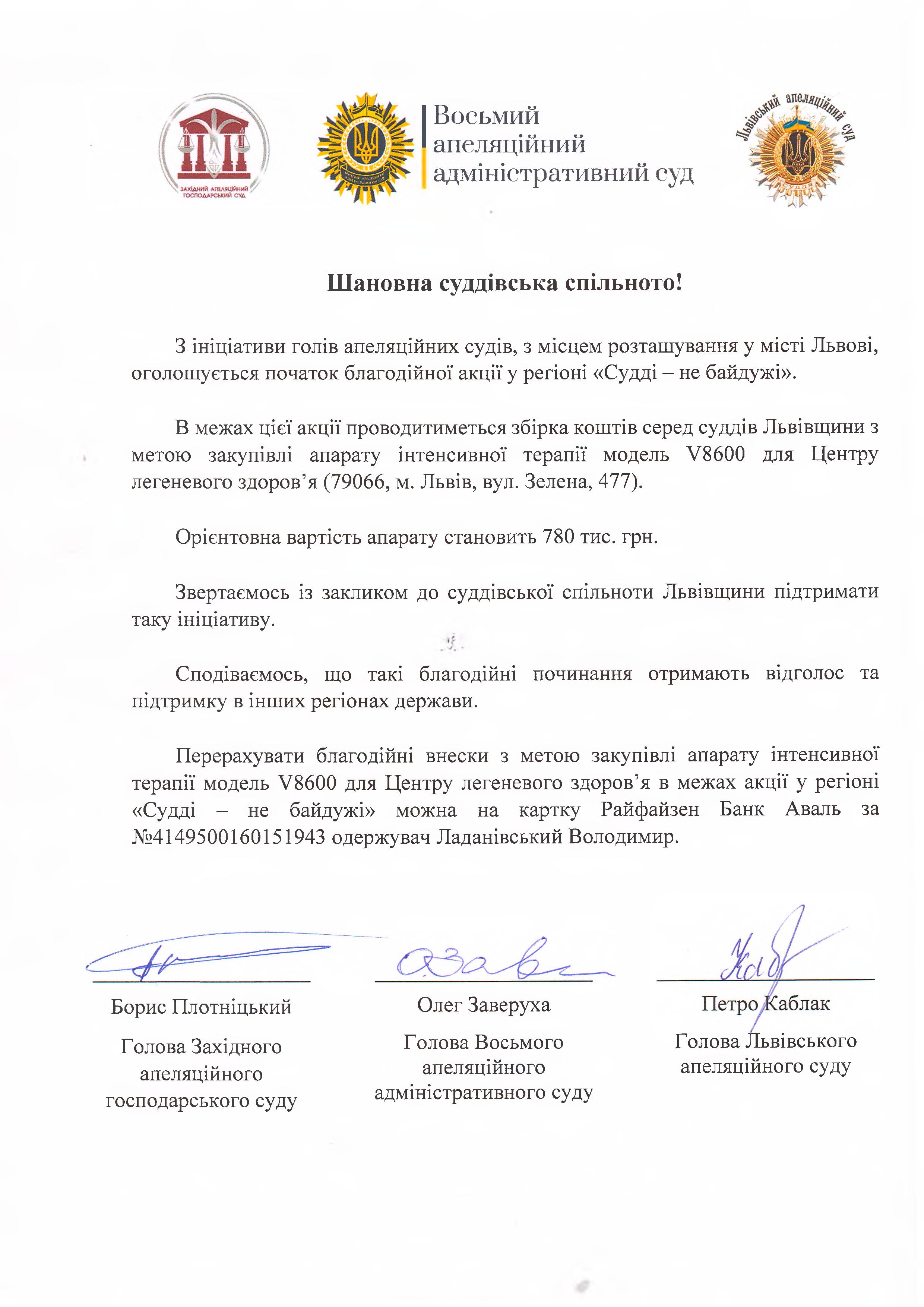 Перерахувати благодійні внески з метою закупівлі апарату інтенсивної терапії для Центру легеневого здоров’я в межах акції у регіоні «Судді – не байдужі» можна на картку Райфайзен Банк Аваль за №4149500160151943 одержувач Ладанівський Володимир.